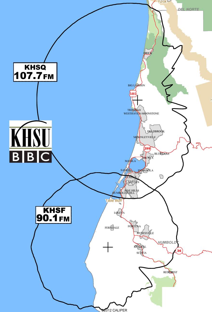 KHSU-BBC is now broadcasting at 90.1 (KHSF, Ferndale) and at 107.7 (KHSQ, Trinidad) for the northern portion of our listening area.