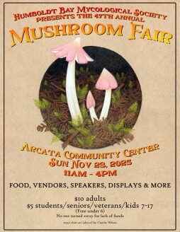 Join the Humboldt Bay Mycological Society for their 47th Annual Mushroom Fair on Sunday, Nov. 23 from 11:00 a.m. to 4:00 p.m. at the Arcata Community Center (321 Dr. M.L.K. Jr Pkwy, Arcata). This enchanting event features fresh mushroom displays, speakers, food, and vendors. The fair is a vital fundraiser for HBMS, a non-profit supporting education throughout the year. Admission is $10.00 for adults, $5.00 for Students, Seniors (60+), Veterans, Kids 7-17, and free for kids under 6. No one turned away for lack of funds. For more details, visit hbmycologicalsociety.org