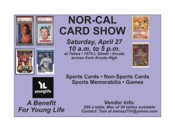 Nor-Cal Card Show on Sat., April 27 (10 a.m. to 5 p.m.) will features vendors selling sports and non-sports cards as well as sports memorabilia and games. It is a fundraiser for the local chapter of Young Life. The card show will be at Telios at 1575 L Street in Arcata, across from Arcata High School.
