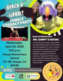Come join Quack and Wabbit Puppet Theater for a Family Literacy Party hosted by Humboldt Literacy Project and Humboldt County Library. Quack & Wabbit uses professional handmade puppets to teach children positive messages and life skills. Their humorous, musical, poignant & tender-hearted stories yield emotional responses in children and are so fun! The super engaging Mr. Gumpy’s Outing is a musical story about cooperation and friendship based on the book by John Burningham. It's fun and geared towards the younger audiences. The performance is enlightening, playful, and full of surprises. This is a free event for children and the adults who love them! Attendees get to choose their own free book to keep.