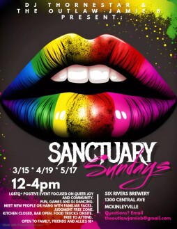 DJ Thornestar and The Outlaw Jamie B present Sanctuary Sundays at Six Rivers Brewery! This LGBTQ+ positive event is a celebration of queer community and joy: Think of it like Gay Church. We’ll start with a mixer to get folx mingling, then a brief inspirational non-denominational moment followed by a mid-day DANCE PARTY with DJ Thornestar!